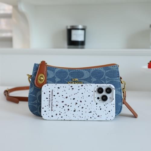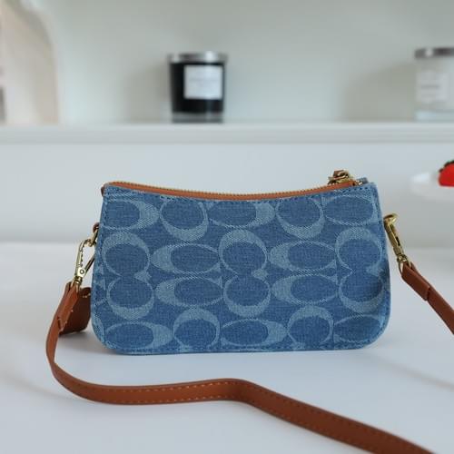 Iconic Coach Signature: Features the classic Coach monogram pattern in a stylish denim blue fabric, blending heritage with modern flair.