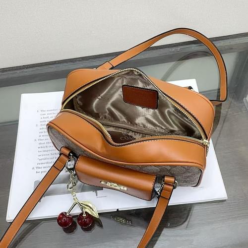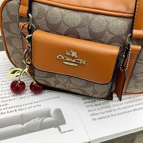 COACH Signature Jacquard Tote Bag with Leather Trim & Cherry Charm Classic Beige/Brown Shoulder Bag