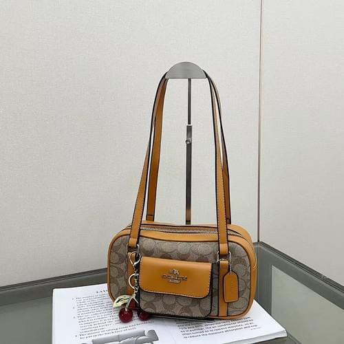 Iconic Monogram – Timeless beige/brown jacquard print with contrasting brown leather accents and "COACH" embossing.