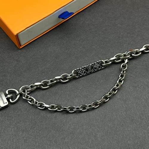 Iconic LV Monogram Detailing – Features the classic LV initials engraved on a sleek rectangular plaque, set against a polished silver chain for timeless luxury.