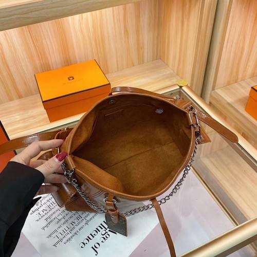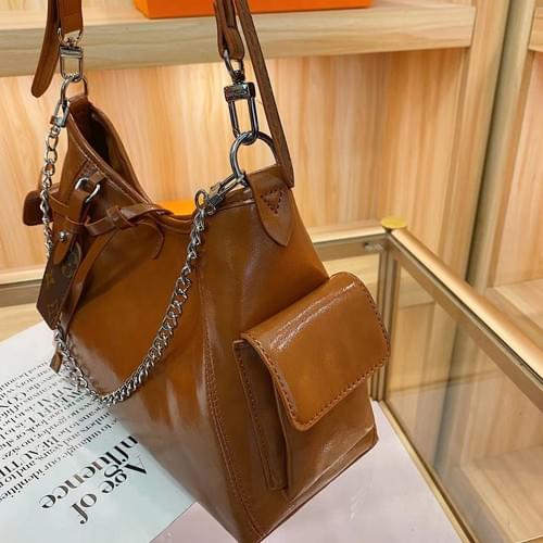 Luxury Handbag Combo – Wine-red leather shoulder bag with metallic chain and embossed brand strap.